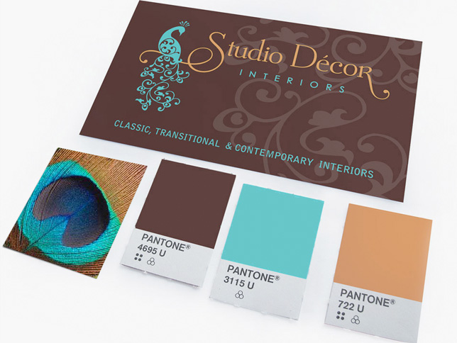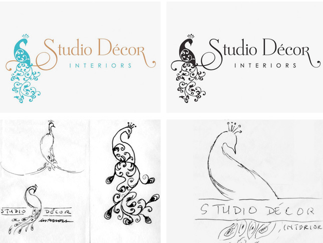 The owners of Studio Décor wanted a logo with a peacock motif—a bird that represents pride and opulence. The new design features a stylized peacock perched on the tail of letter 'S' in the company's name. Colors were sampled from a photo of a real peacock feather. Application: business stationery, website.