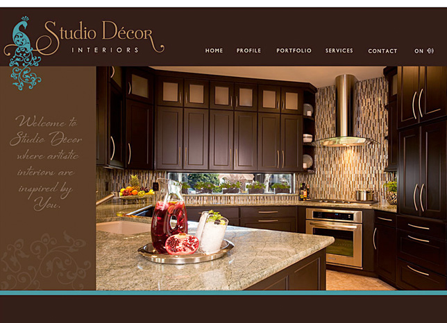 The owners of Studio Décor wanted a logo with a peacock motif—a bird that represents pride and opulence. The new design features a stylized peacock perched on the tail of letter 'S' in the company's name. Colors were sampled from a photo of a real peacock feather. Application: business stationery, website.